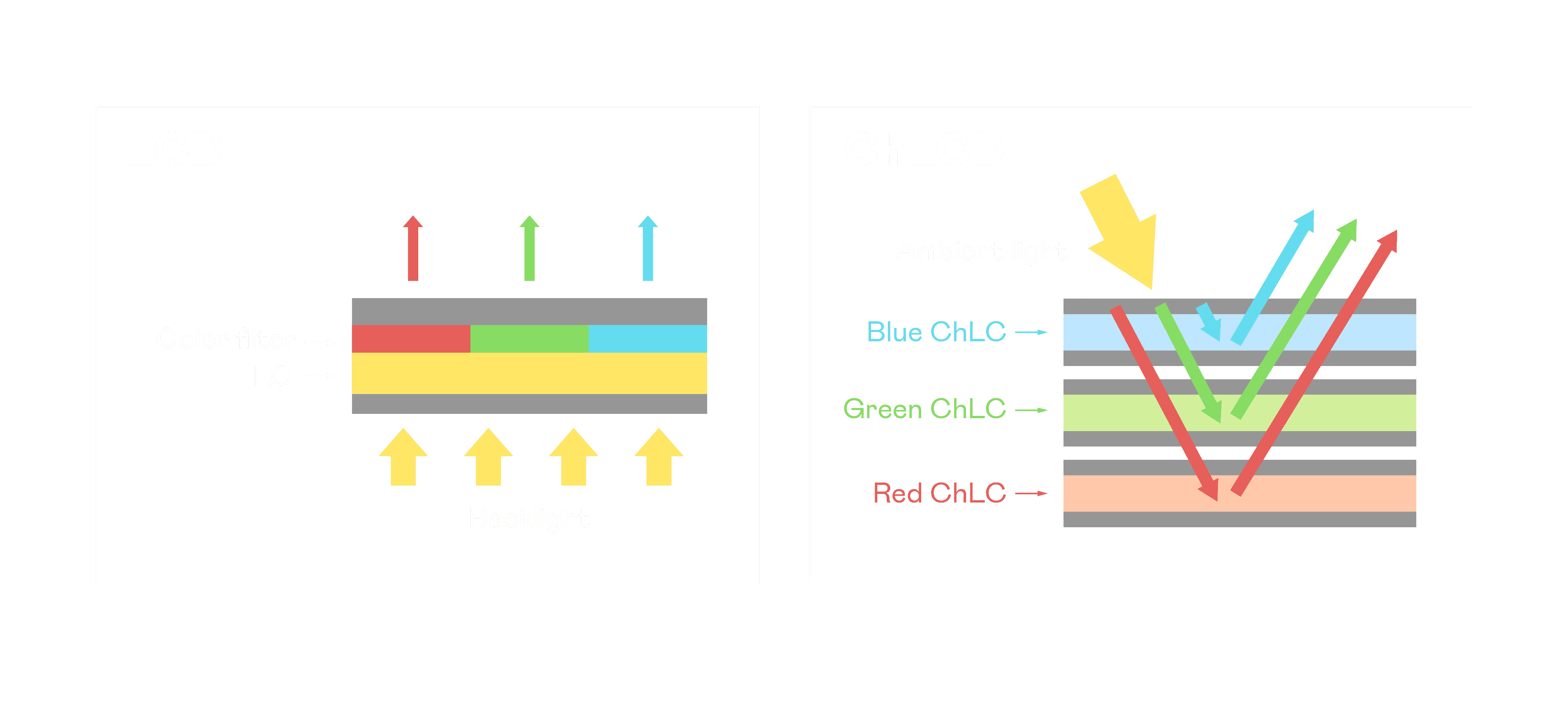 Wepay胆固醇液晶显示器是由红、、、、绿、、、、蓝三层胆固醇液晶面板堆叠而成,,,并采用无彩色滤光片设计,,,减少环境光在反射过程中的损耗。。。