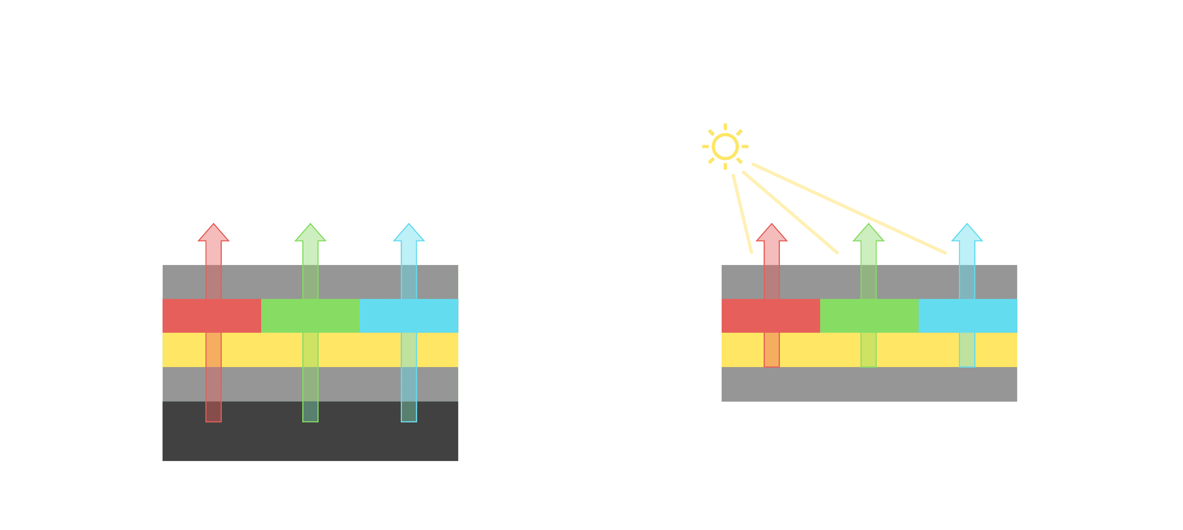 与传统需搭配背光单元的液晶显示相比,,反射式液晶技术不仅更省电、、、、更轻薄,,,且即便在艳阳下仍能清晰显示。。。此外,,,,少了背光单元,,也大幅降低了 LED 蓝光伤害眼睛的疑虑。。。